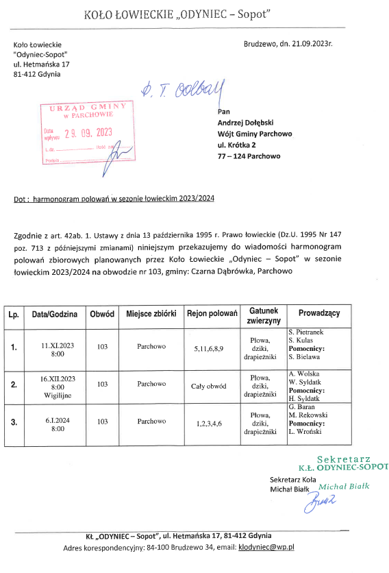 Harmonogram polowań zbiorowych Koła Łowieckiego Odyniec - Sopot